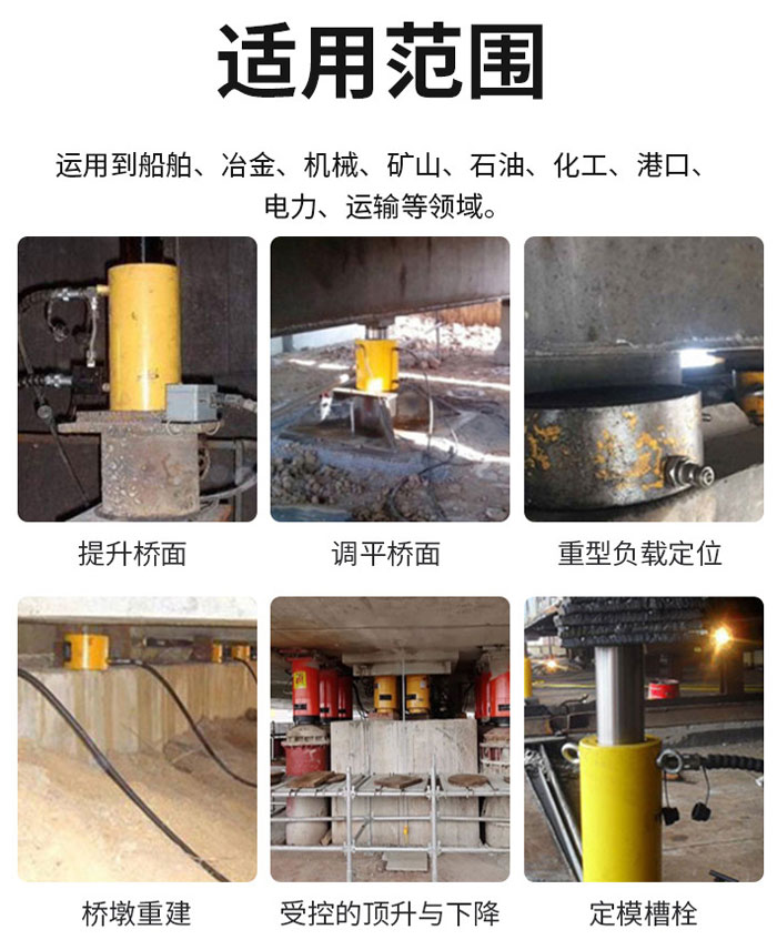 單作用中空千斤頂應(yīng)用及其廣泛,適用于加工,維修牽引作業(yè)。在需要牽引的作業(yè)中,特殊的空心活塞設(shè)計(jì)使?fàn)恳龡U或鋼索能夠穿過(guò)整個(gè)千斤頂進(jìn)行作業(yè),在各種壓合和機(jī)械牽引系統(tǒng)工作中,常用于向后牽引和向前擠壓的作業(yè)。當(dāng)裝備有可互換的鋼制強(qiáng)化活塞底座時(shí),也能用于常規(guī)的舉升作業(yè)。